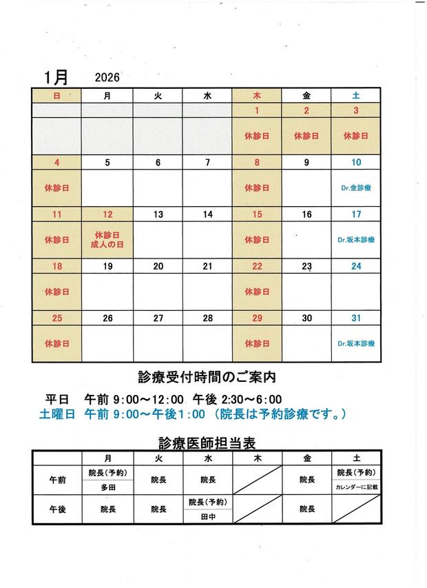 1月の診療カレンダー