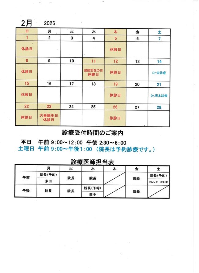 2月の診療カレンダー