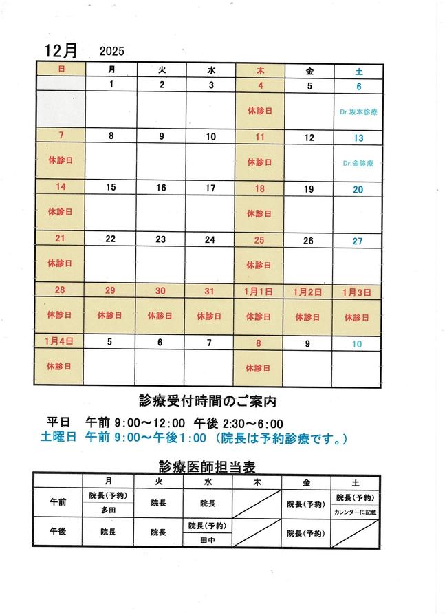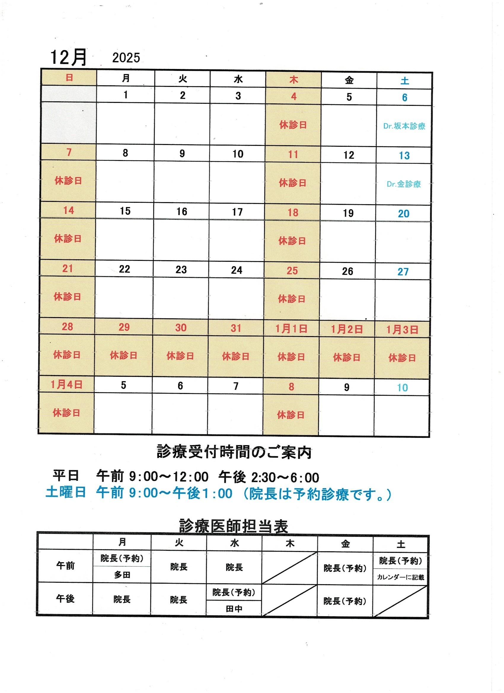 12月の診療カレンダー