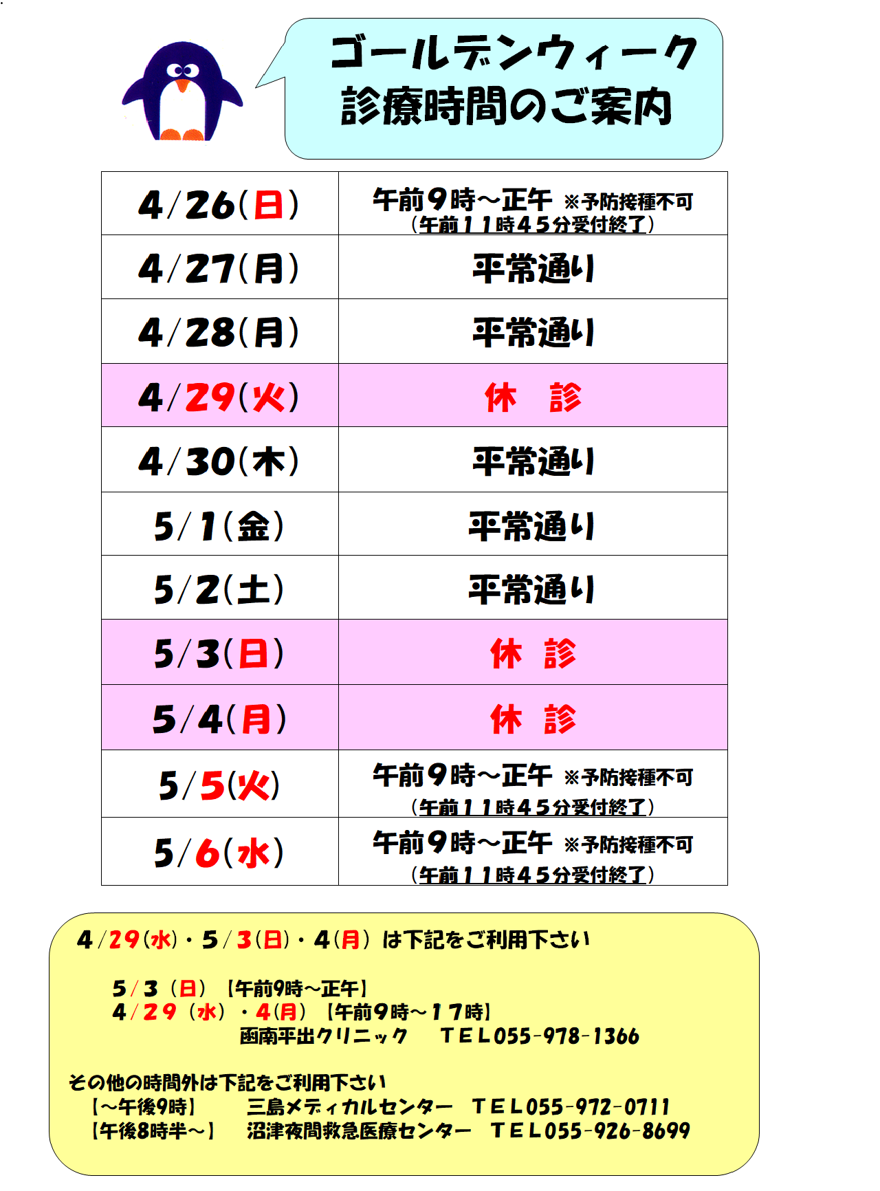 ■2026年 4月 15日 ゴールデンウィークの診療に